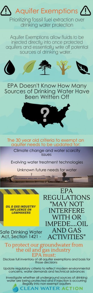 Both of the reports we released today reveal problems in the UIC program that result from this almost contradictory mandate in the law. The Aquifer Exemption program is exactly what it sounds like. In order to make some oil and gas activities legal, EPA had to come up with a way of defining some aquifers as “not drinking water” in order to allow injection directly into them. These Exemptions have been used primarily for some kinds of oil and gas extraction, for wastewater disposal and for uranium mining. Our research has found serious gaps in documentation of decisions and in oversight of this program. Read Aquifer Exemptions: A First-Ever Look at the Regulatory Program That Writes Off Drinking Water Resources for Oil, Gas and Uranium Profits here.