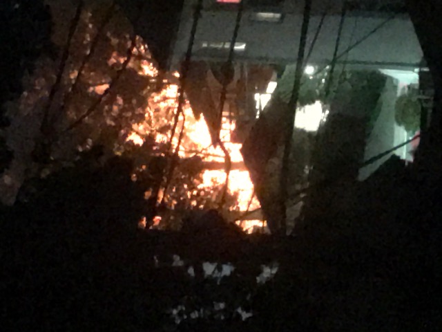 I got up and looked out the window. First I saw sparks drifting into my yard at treetop level. And then I pulled the curtain all the way back and saw it: a massive inferno through the trees and houses. “Oh no!!” I involuntarily repeated aloud several times.