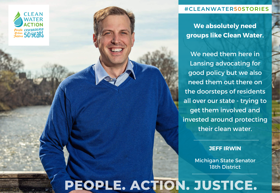 To celebrate Clean Water Action's 50th anniversary, we’re sharing our history and journey with the people who have joined us along the way as we worked to protect clean water through #CleanWater50Stories. Michigan Senator Jeff Irwin has long been a champion on the issues that affect water resources in Michigan and the Great Lakes. In his time in the Michigan State House Senator Irwin received Clean Water Action’s Lawmaker of the Year Award and has continued to be a strong environmental advocate in the state Senate. Clean Water Action is grateful to Senator Irwin for his leadership and partnership throughout the years, as well as taking the time to record these thoughts to share in honor of our 50th year: