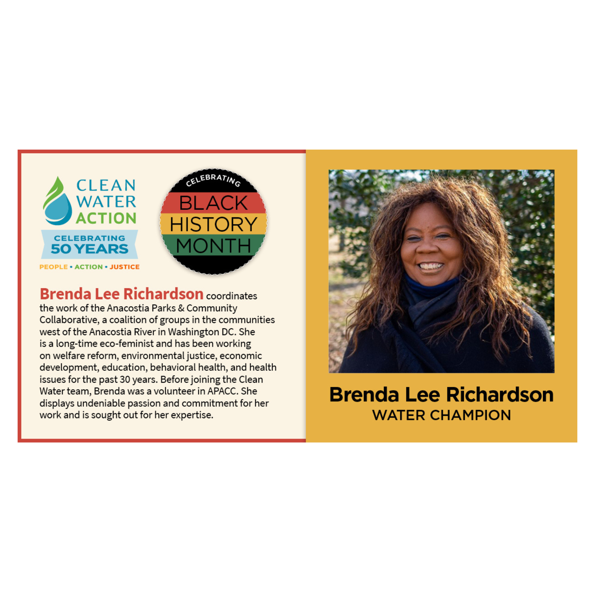 Today’s Black History Water Champion is Brenda Lee Richardson, who coordinates the work of the Anacostia Parks & Community Collaborative, a coalition of groups in the communities west of the Anacostia River in Washington DC. Brenda is a long-time eco-feminist and has been working on welfare reform, environmental justice, economic development, education, behavioral health, and health issues for the past 30 years. Before joining the Clean Water team, Brenda was a volunteer in APACC. Brenda is also a business owner serving as President of Chozen Consulting LLC, a consulting company that focuses on community engagement, facilitation, training and government relations, and is the Principal for "Women Like Us," an initiative that focuses on design thinking for woman. She has and continues to displayed passion and commitment to her work and and is deserving of this recognition.