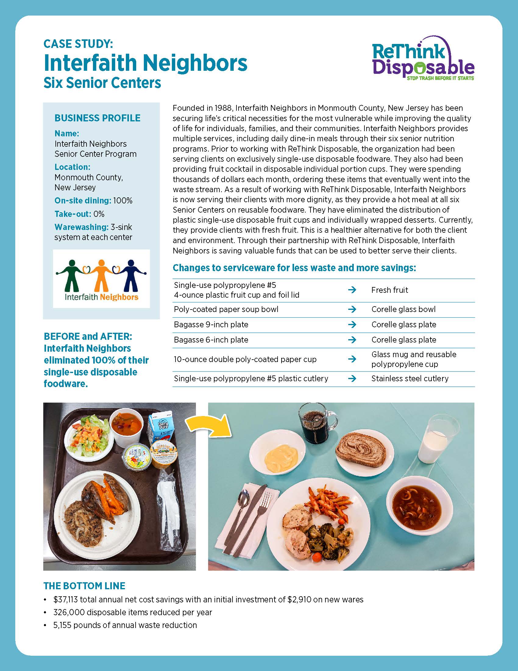 As a result of working with ReThink Disposable, Interfaith Neighbors is now serving their clients with more dignity, as they provide a hot meal at all six Senior Centers on reusable foodware. They have eliminated the distribution of plastic single-use disposable fruit cups and individually wrapped desserts. Currently, they provide clients with fresh fruit. This is a healthier alternative for both the client and environment. Through their partnership with ReThink Disposable, Interfaith Neighbors is saving valuable funds that can be used to better serve their clients.