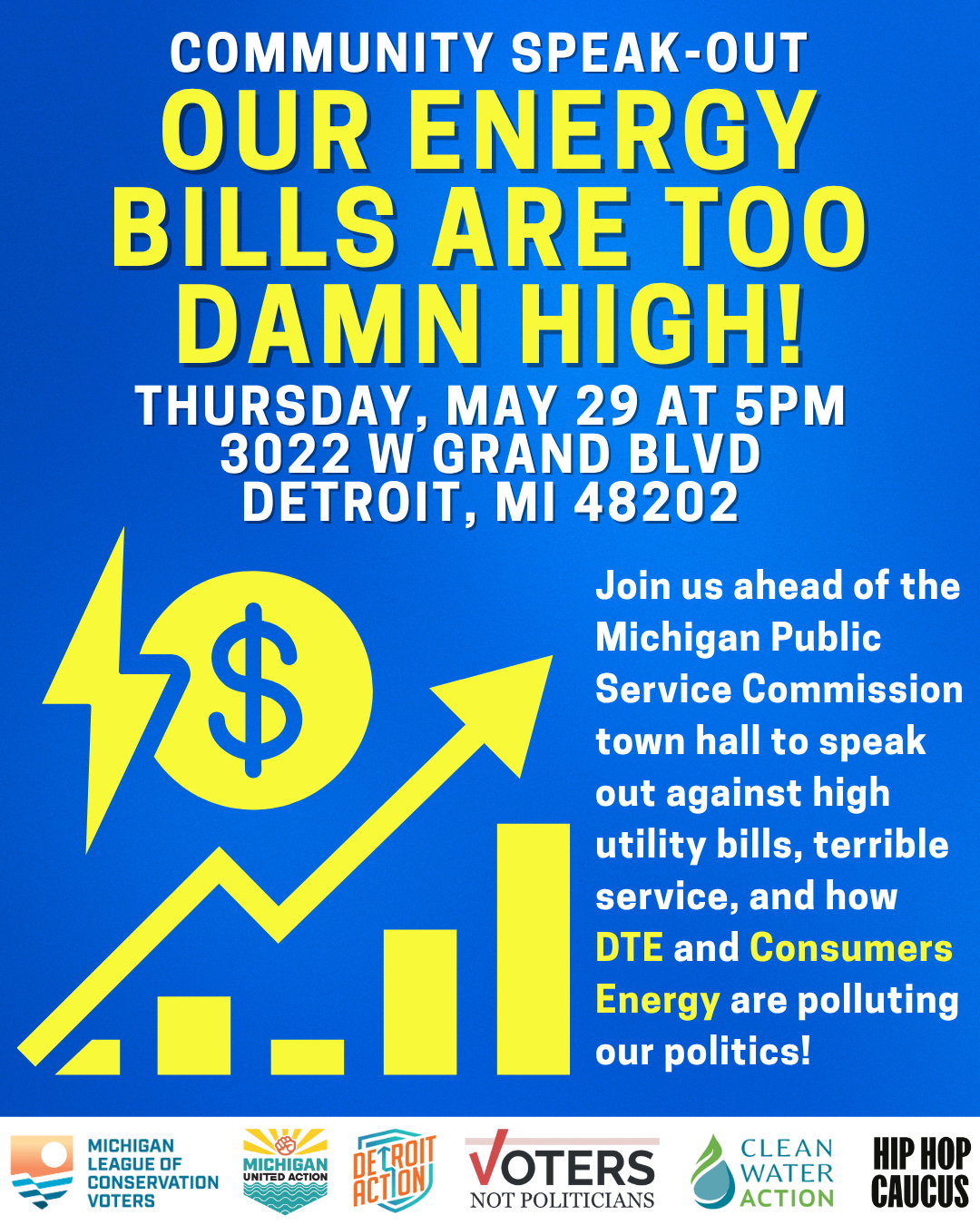 Join us and and partners for a town hall event to voice your concerns on high energy costs and poor reliability from DTE Energy.