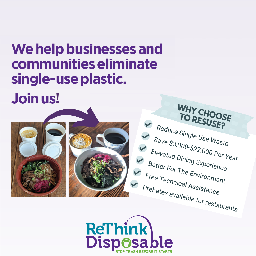 ReThink Disposable is a technical assistance program that helps food service operators reduce waste, including plastic pollution into our waterways, while cutting costs by replacing disposable packaging items. Whether you are a caterer, a mobile food vendor, host events, or run a restaurant, café or institutional kitchen, ReThink Disposable can help you: