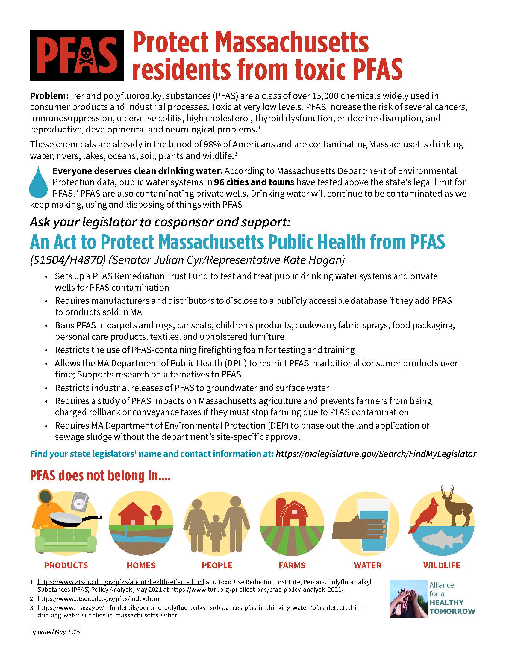 Per and polyfluoroalkyl substances (PFAS) are a class of over 15,000 chemicals widely used in consumer products and industrial processes. Toxic at very low levels, these chemicals are already in the blood of 98% of Americans and are contaminating Massachusetts drinking water, rivers, lakes, oceans, soil, plants and wildlife. Learn about 2026 legislation to protect our water and health from PFAS!