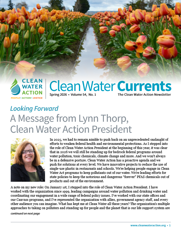 In 2025, we had to remain nimble to push back on an unprecedented onslaught of efforts to weaken federal health and environmental protections. As I stepped into the role of Clean Water Action President at the beginning of this year, it was clear that in 2026 we will still be standing up for bedrock federal programs around water pollution, toxic chemicals, climate change and more. And we won’t always be in a defensive posture. Clean Water Action has a proactive agenda, and we push for solutions at every level. We have innovative projects to reduce the use of single-use plastic in restaurants and schools. We’re helping people engage in Clean Water Act programs to keep pollutants out of our water. We’re leading efforts for state policies to keep the notorious and dangerous “forever” PFAS chemicals out of products and out of the environment.