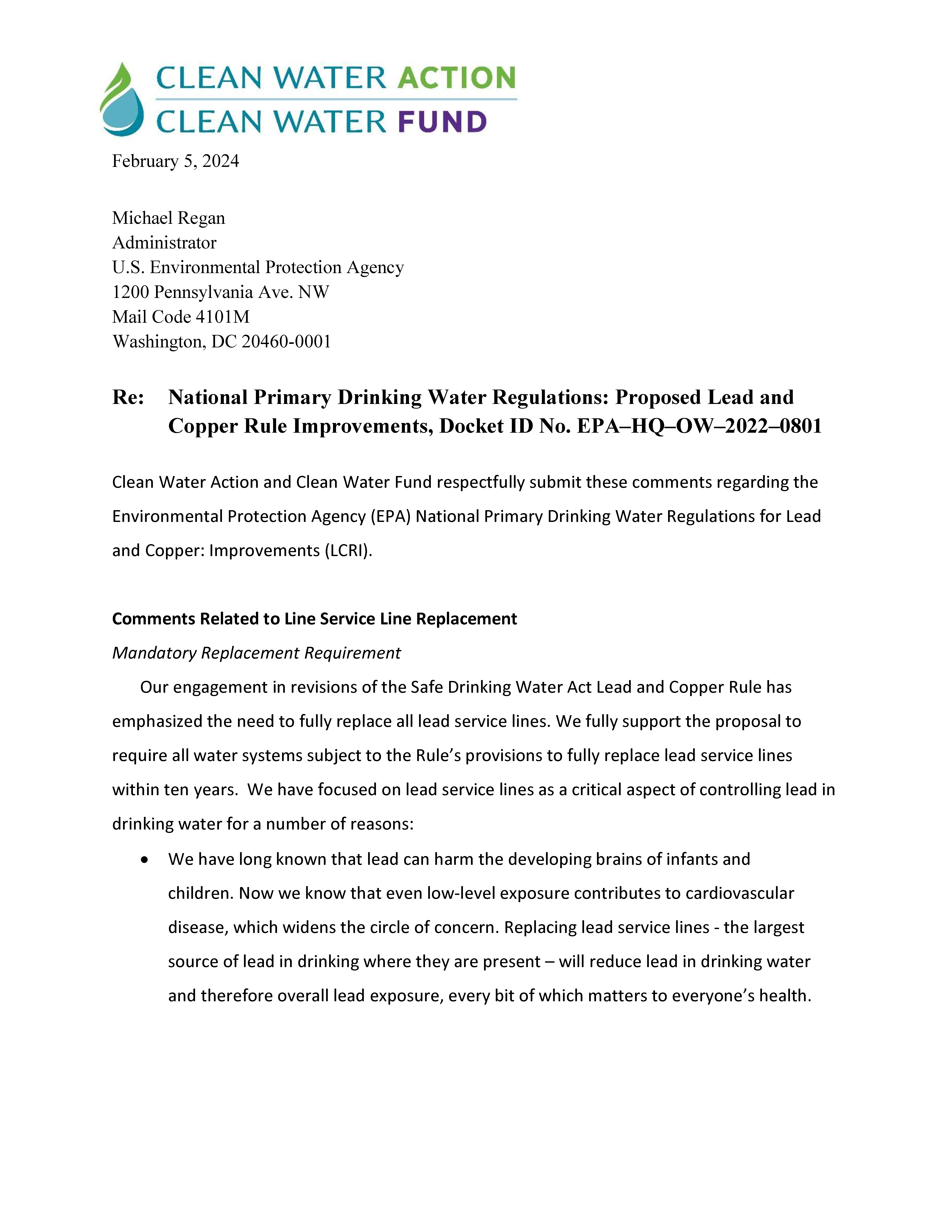 Clean Water Action and Clean Water Fund respectfully submit these comments regarding the Environmental Protection Agency (EPA) National Primary Drinking Water Regulations for Lead and Copper: Improvements (LCRI).