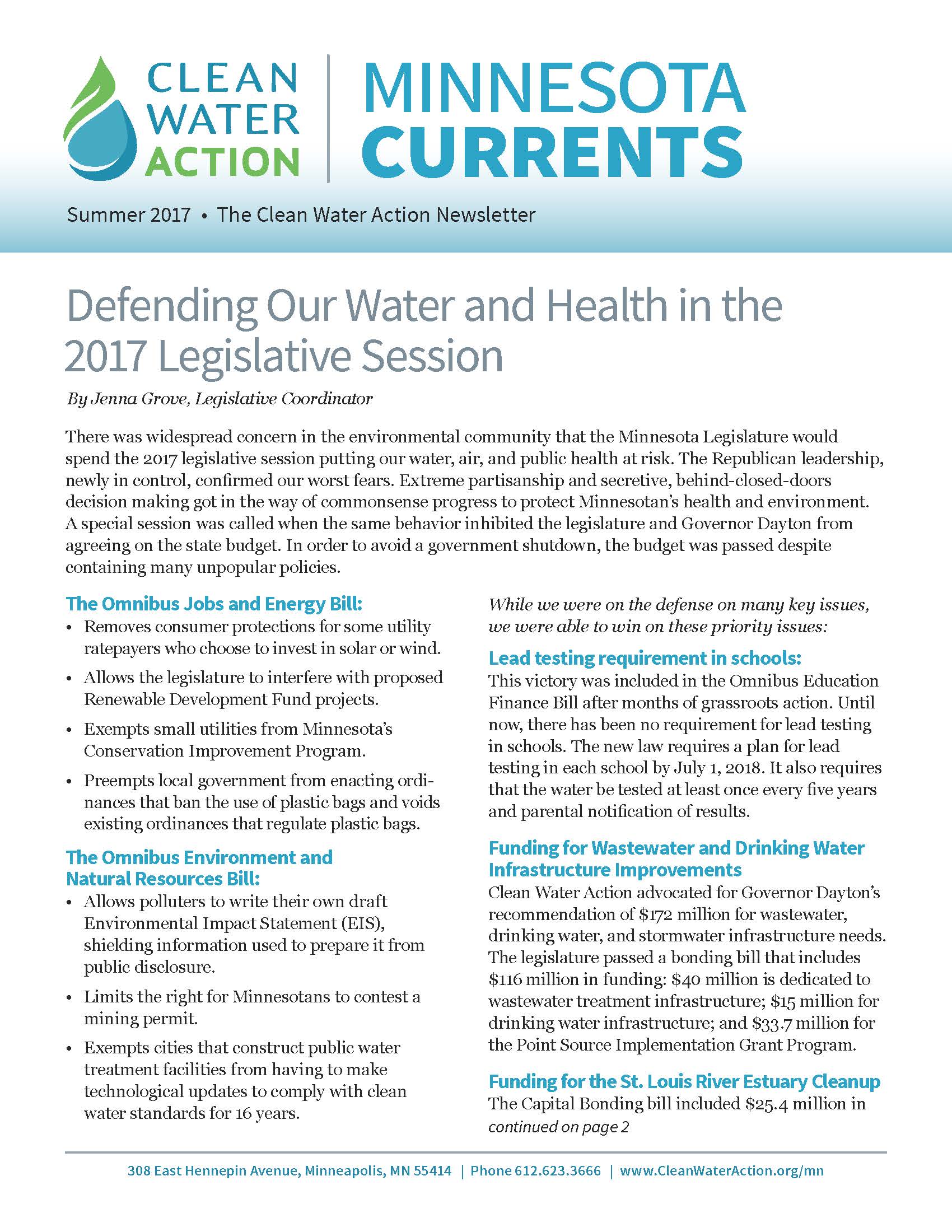 Overall this session, the legislature did take steps to improve water quality and protect drinking water for children across Minnesota but they took too many steps backward on key environmental protections. There is still a lot to be done to put the health and well-being of our communities first. Now that session is over, it’s time to hold legislators accountable for the decisions they made and urge them to make these issues a priority when they return to St. Paul for the 2018 legislative session.